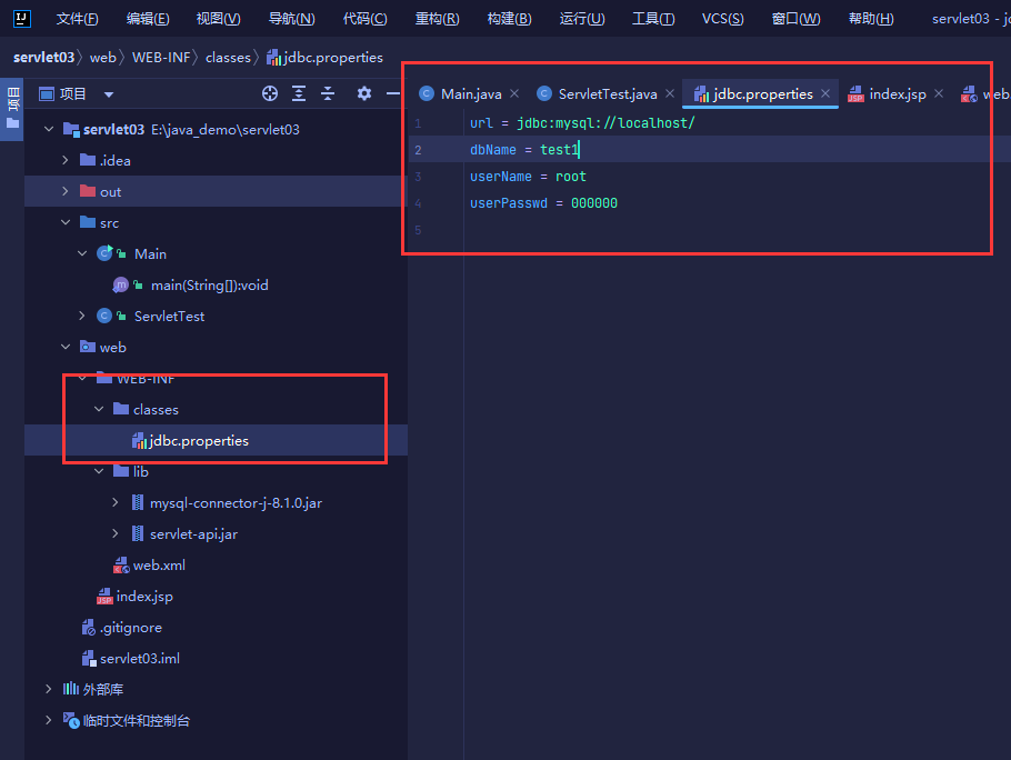 jdbc.properties 文件是一个常见的配置文件,用于配置 Java 程序中使用的 JDBC(Java Database Connectivity)连接属性,在 WEB-INF—classes 目录下新建,输入我们的路径