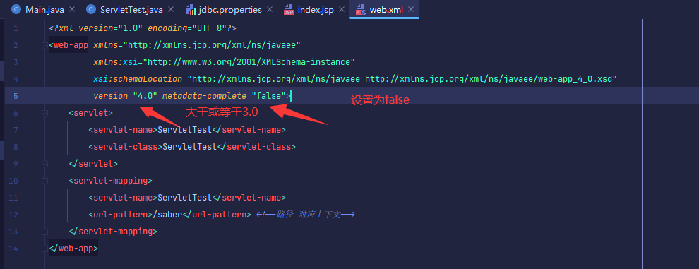 | <?xml version="1.0" encoding="UTF-8"?> <web-app xmlns="http://xmlns.jcp.org/xml/ns/javaee" xmlns:xsi="http://www.w3.org/2001/XMLSchema-instance" xsi:schemaLocation="http://xmlns.jcp.org/xml/ns/javaee http://xmlns.jcp.org/xml/ns/javaee/web-app_4_0.xsd" version="4.0"> <servlet> <servlet-name>ServletTest</servlet-name> <servlet-class>ServletTest</servlet-class> </servlet> <servlet-mapping> <servlet-name>ServletTest</servlet-name> <url-pattern>/saber</url-pattern> <!--路径 对应上下文--> </servlet-mapping>